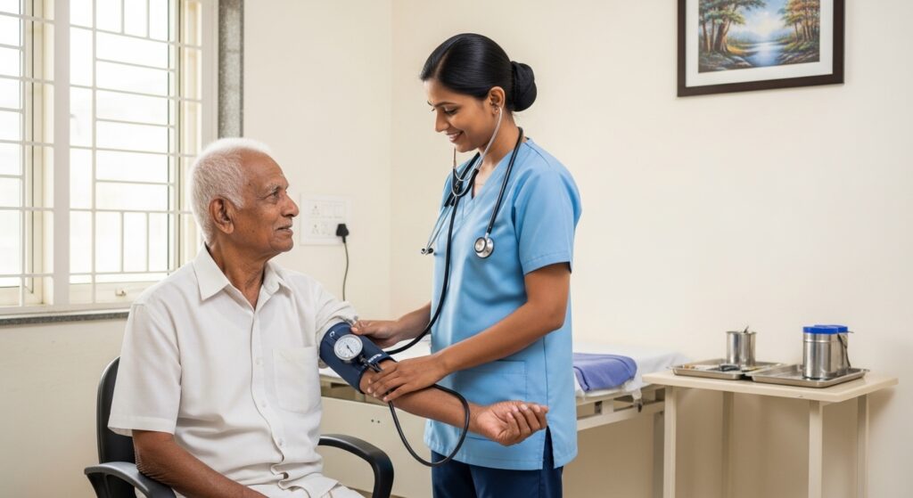 Regular health monitoring, medication support, and doctor consultations help elders maintain better health and comfort.